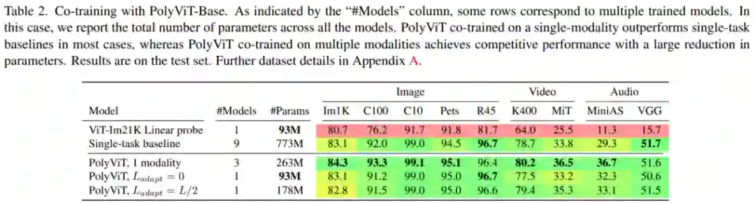 下表 2 展示了用于解决跨图像、音频和视频三种模态的 9 个不同任务的模型训练方法,包括 ViT-Im21K Linear probe、Single-task baseline 和本文的 PolyViT 及变体(分别是 PolyViT L_adapt = 0 和 PolyViT Ladapt = L/2)。