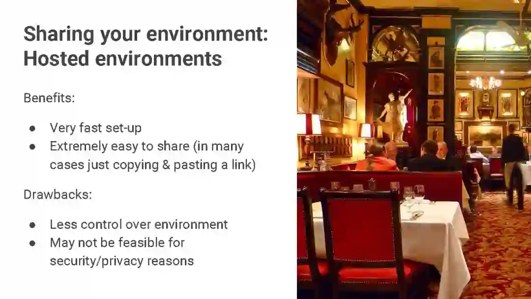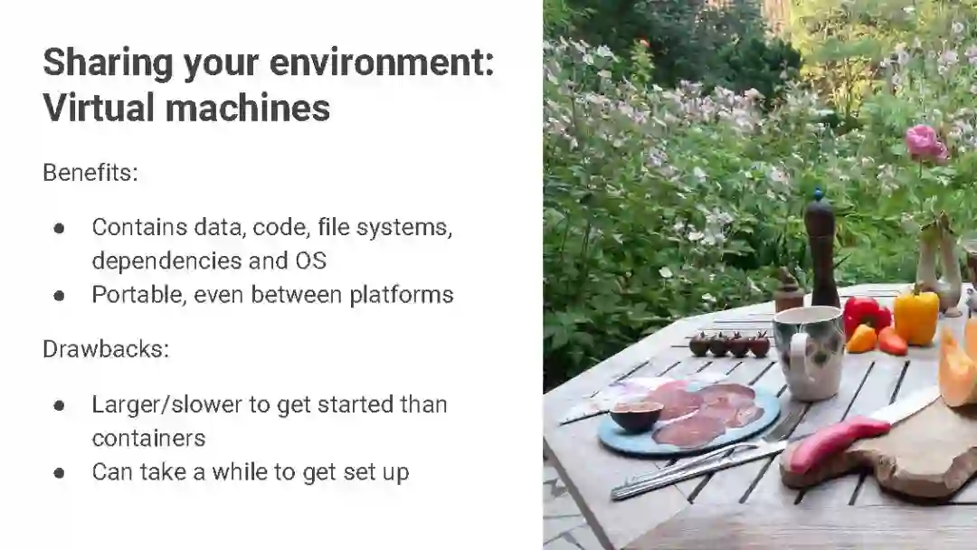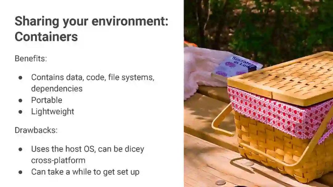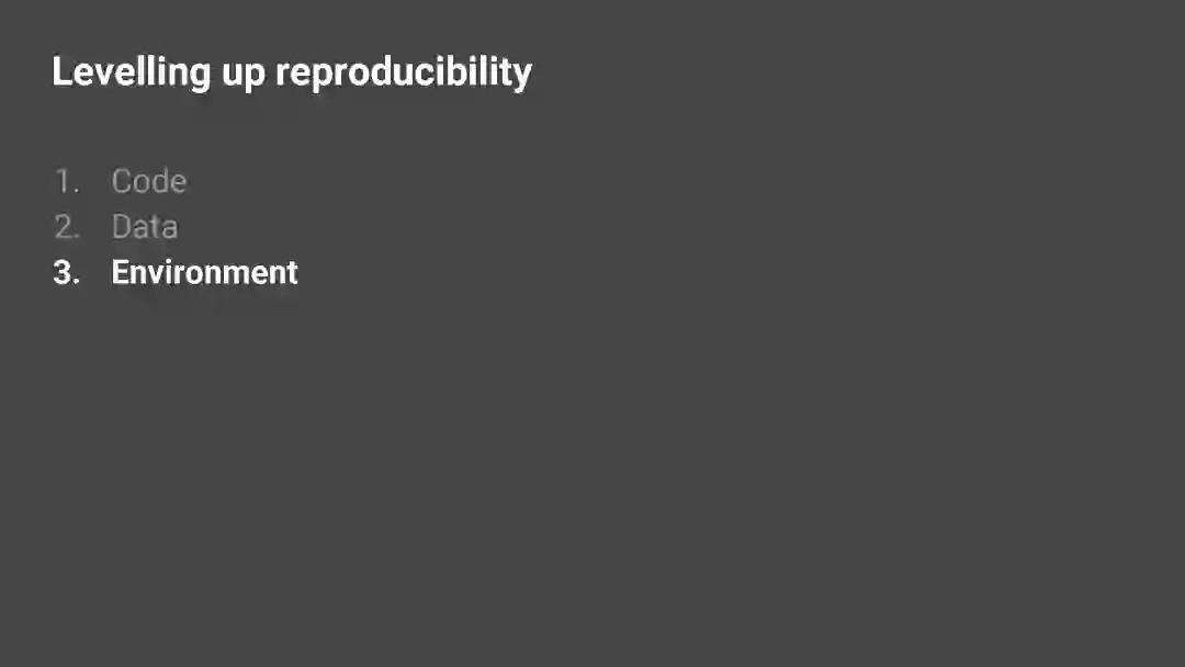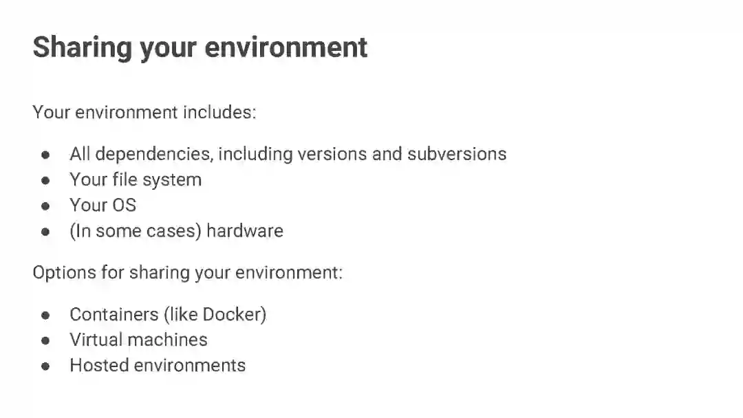计算环境(Computing environment):标准化你的运行代码的计算环境,以确保最后输出结果的一致性。