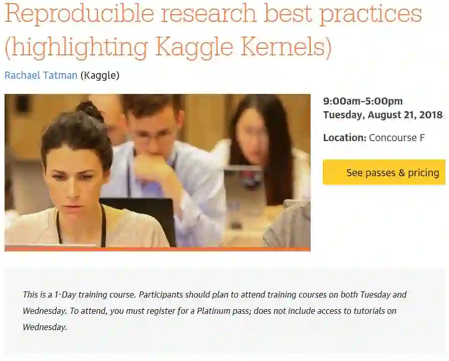 Reproducible research best practices (highlighting Kaggle Kernels), 这是一个一天课程量的训练课程。在该课程中,Rachael Tatman向你展示如何进行一个现有的研究项目,并利用Kaggle Kernels使这个项目完全可重现出来。通过课程中介绍三个关键点来实现项目的可重复性,你可以学到绝佳的实践经验和技巧。