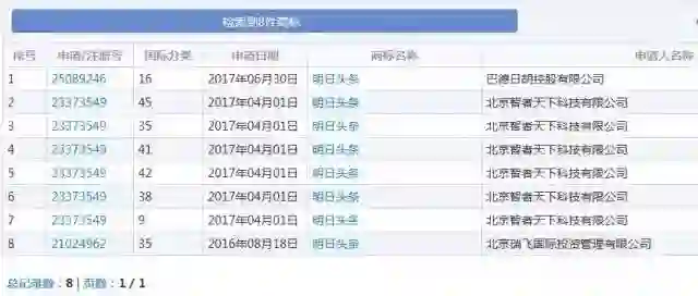 “高沃知识产权”称,目前涉及“明日头条”的商标注册有8个,都处于申请注册阶段,尚未注册下来,其中注册方并没有新浪公司。