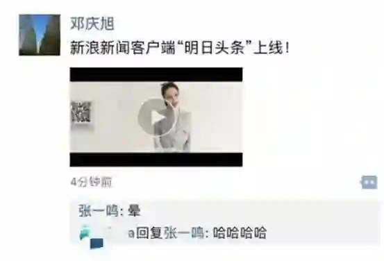 直到传出一张朋友圈截图,新浪网副总裁邓庆旭宣布“明日头条”上线,今日头条CEO张一鸣给出一字评论:晕。