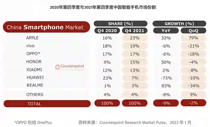 根据调研机构Counterpoint发布的中国手机市场报告,2021年第四季度,苹果超过vivo,以23%市场份额,位居第一。这是苹果自2015年iPhone 6的巅峰之后,时隔六年再度拿下中国市场的季度销量冠军。