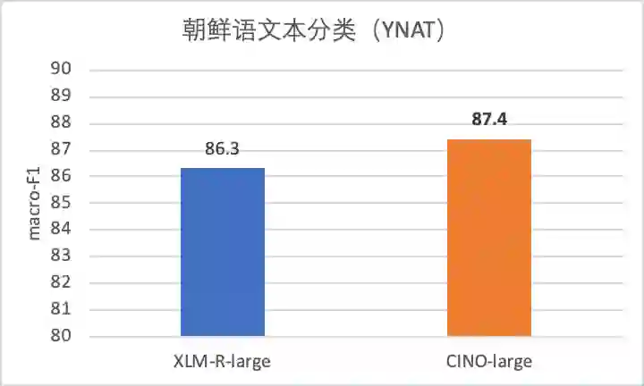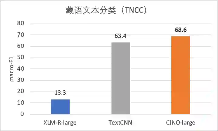 我们在新构建的WCM多语言分类数据集、KLUE推出的朝鲜语文本分类YNAT、复旦大学推出的藏语文本分类TNCC上验证了模型效果。CINO相比其他基线模型获得了显著的性能提升。