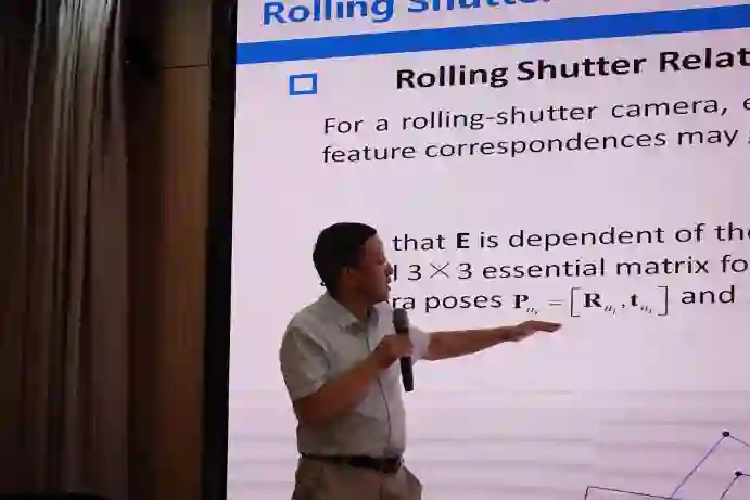 来自西北工业大学的戴玉超教授带来了题目为“卷帘快门相机”的报告。报告指出卷帘快门相机以逐行曝光的方式进行数据采集,不同行的像素点具有不同的曝光时间,同时也对应着不同的相机位姿,并从多视几何模型构建、几何优化求解和基于深度学习方法等方面介绍了研究组在使用卷帘快门进行图像处理方面的一系列关键技术和最新进展,最后戴玉超教授也对卷帘快门相机相关研究的应用前景进行了展望和讨论。