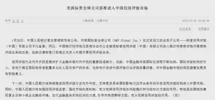 雷锋网AI金融评论报道,1月28日,央行在官网发布了美国标普全球公司获准进入中国信用评级市场的消息。