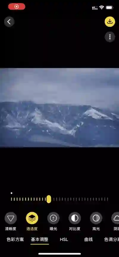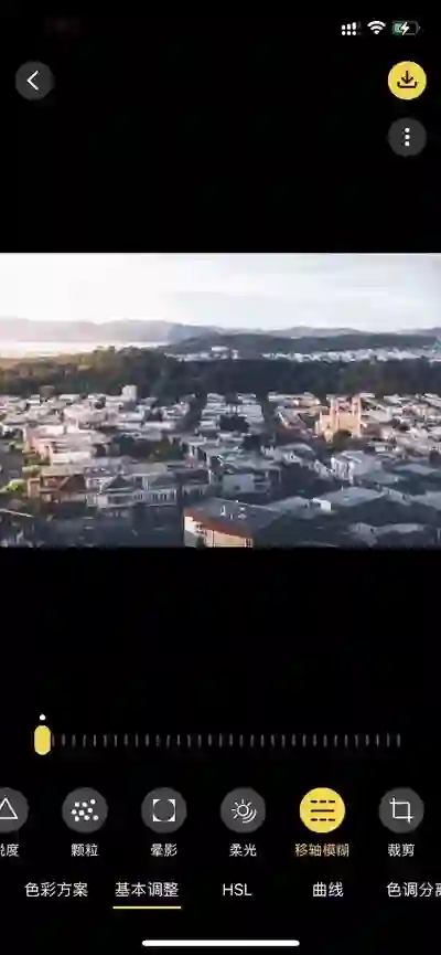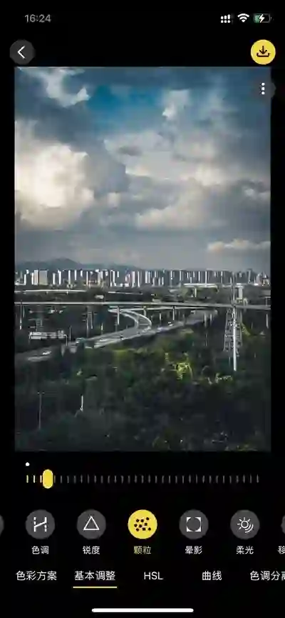 在修图功能里也包含颗粒调整,与相机里颗粒不同的是可以精细化地调整颗粒强度,相机中是选择强弱,在这里可以更加灵活地选择自己喜爱的颗粒强度。