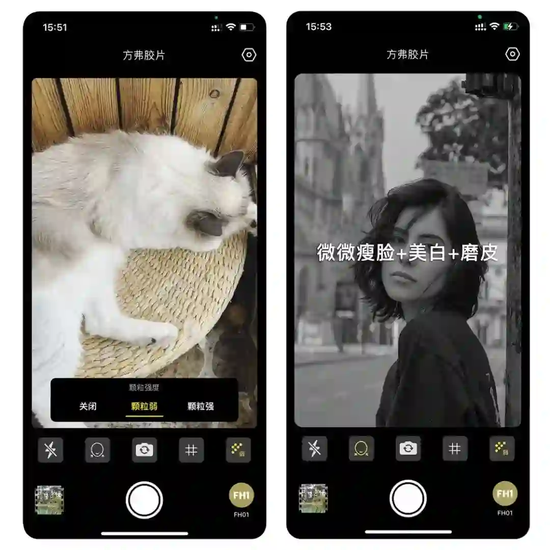 谁说胶片感就不能美颜,很多胶片模拟的 App 都没有美颜的选项,但是对于方弗相机,胶片也可以美颜,方弗相机拍照界面有一个独立的美颜按钮,选中之后可以自动瘦脸 + 美白 + 磨皮,对取景器范围内所有出现的人脸都可以自动处理。