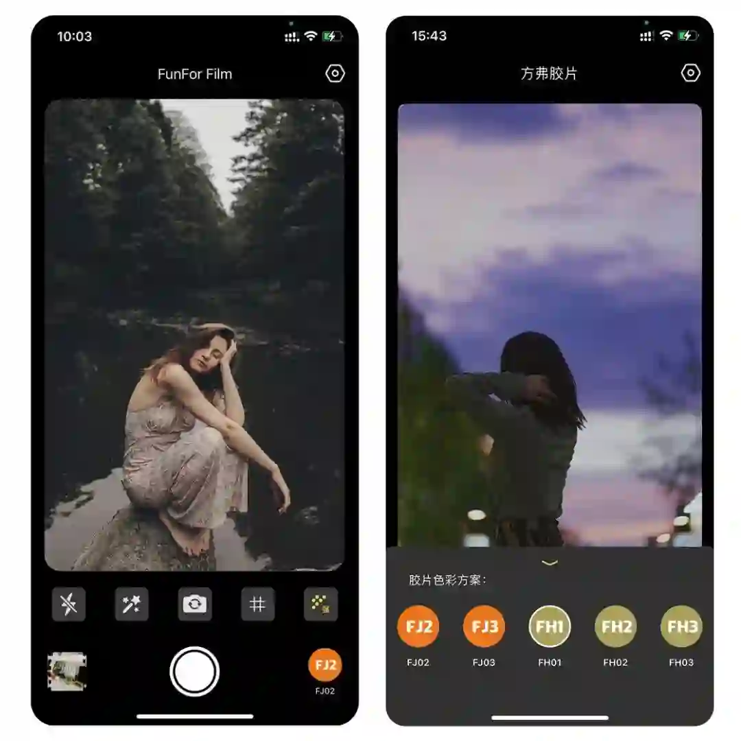 方弗相机的拍照功能,主要是为了满足喜欢胶片感的拍摄需求,选一个自己喜欢的胶片色彩,直接拍就可以。在拍照界面的右下角可以更换色彩方案,方弗相机的色彩方案,并不是直接模仿某个胶片的色彩,所以并不能用一种品牌或是一种胶卷的名字来命名,所以我们自己命名了一套色彩名称。