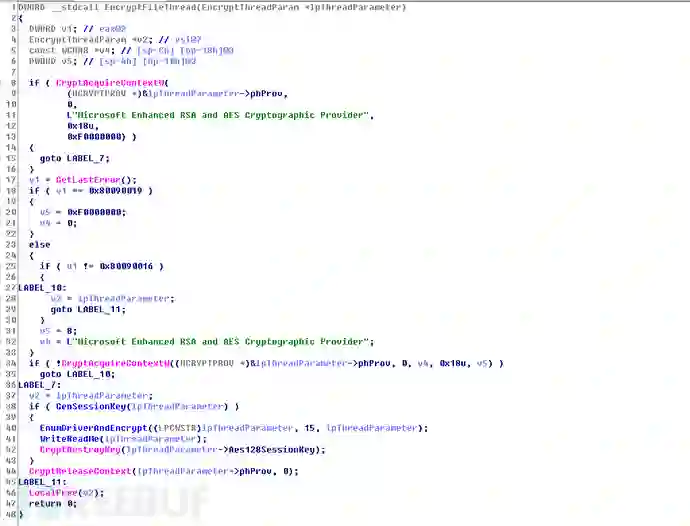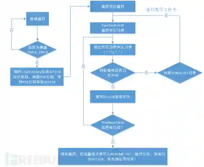 Petya采用RSA2048 + AES128的方式对文件进行加密,程序中硬编码RSA公钥文件,每一个盘符会生成一个AES128的会话密钥,该盘符所有文件均对该AES Key进行加密。