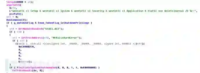 执行完加密文件和网络传播流程后,病毒将清除Windows系统日志并强制重启。重启后将执行病毒写入的MBR并加密磁盘。加密完成后显示勒索信息并等待用户输入key。