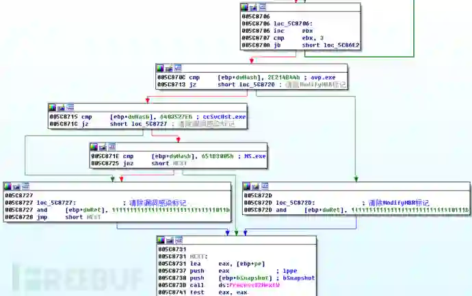 然后,通过CreateToolhelp32Snapshot枚举系统进程,判断是否有指定的安全软件,并设置标记。