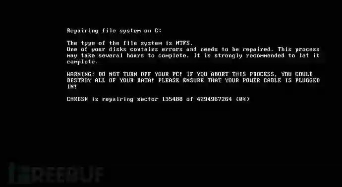 当系统重启后,执行病毒的MBR,伪装成CHKDSK进行加密磁盘,加密完成后弹出敲诈信息对用户进行敲诈。
