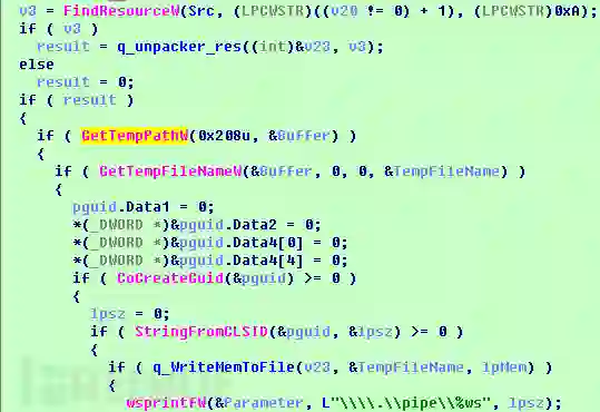 进程首先从资源中解压缩ID为1的资源,在系统的%TEMP%目录下生成一个临时文件。