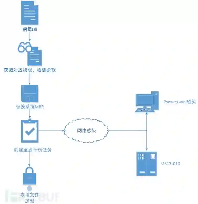 Petya勒索病毒早已被安全厂商披露,而此次Petya卷土重来,肆虐欧洲大陆在于其利用了已知的OFFICE漏洞、永恒之蓝SMB漏洞、局域网感染等网络自我复制技术,使得病毒可以在短时间内呈暴发态势。另一方面,Petya木马主要通过加密硬盘驱动器主文件表(MFT),使主引导记录(MBR)不可操作,通过占用物理磁盘上的文件名、大小和位置的信息来限制对完整系统的访问,从而让电脑无法启动,相较普通勒索软件对系统更具破坏性。