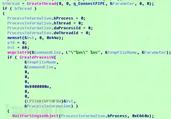 随后程序启动线程尝试连接特定的命名管道并读取数据,随后将该临时文件作为进程启动,并且等待1分钟。