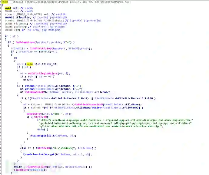 下一步生成随机ip,连接445端口进行永恒之蓝漏洞攻击。然后遍历磁盘,对指定扩展名的文件进行加密。执行完所有流程后,清除日志并强行重启。