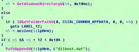 之后程序加载资源序号3并且解压缩,首先获取系统文件夹目录,若失败则获取%APPDATA%目录,并将解压后的资源命名为dllhost.dat写入到该目录下。