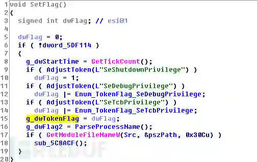 首先,Petya病毒会尝试提升当前进程的3种权限:SeShutdownPrivilege、SeDebugPrivilege和SeTcbPrivilege,根据是否成功设置标记,后面执行相应的流程时会判断此标记,以防没有权限时系统报错。