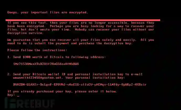 此次黑客使用的是Petya勒索病毒的变种,使用的传播攻击形式和WannaCry类似,但该病毒除了使用了永恒之蓝(MS17-010)漏洞,还罕见的使用了黑客的横向渗透攻击技术。在勒索技术方面与WannaCry等勒索软件不同之处在于,Petya木马主要通过加密硬盘驱动器主文件表(MFT),使主引导记录(MBR)不可操作,通过占用物理磁盘上的文件名、大小和位置的信息来限制对完整系统的访问,从而让电脑无法启动,故而其影响更加严重。如果想要恢复,需要支付价值相当于300美元的比特币。