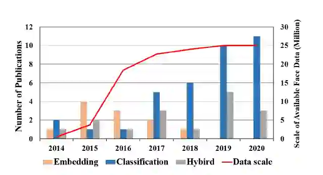 图 8:三种监督人脸表示学习方法与公开数据集规模的发布趋势