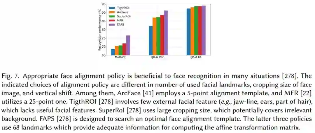同时,研究者进一步讨论了五种不同的对齐方法对人脸识别性能的影响。下图 6 中的实验结果表明恰当的对齐策略能够有利于提升人脸识别性能。