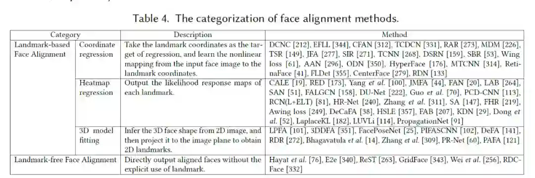 人脸对齐的目标是将检测到的人脸校准到一个规范的标准化视图,并裁剪为固定图像尺寸的图像,这是提高人脸识别性能的必要步骤。人脸对齐方法包括基于关键点对齐和不使用关键点的两种技术方案。其中,基于关键点的对齐方法是目前最常用的方案,根据如何获取关键点可分为坐标点回归、热力图回归以及 3D 模型拟合三种方法。不使用关键点的人脸对齐方法通过可学习的方式直接生成对齐后的人脸图像,具体分类可以参考下表 2。
