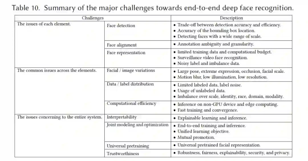 最后,研究者分析了端到端人脸识别系统各个组成要素现有的问题和未来趋势,同时还有三种要素共有的挑战,以及面向整个识别系统的角度讨论了现有挑战和发展方向,如下表 4 所示。