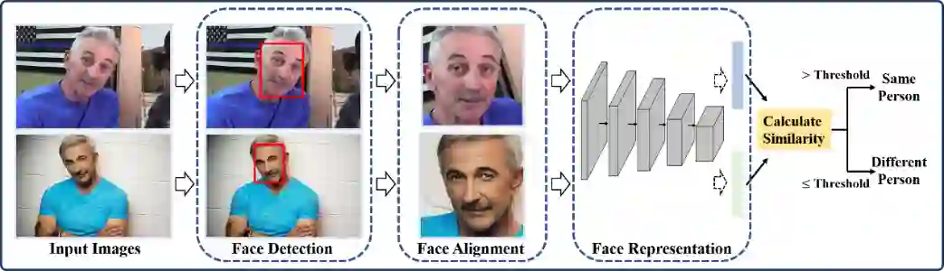 端到端深度人脸识别系统由三个关键要素构成:人脸检测(face detection)、人脸对齐(face alignment)和人脸表征(face representation)。其中,人脸检测的作用是定位静止图像或视频帧中的人脸位置。然后,人脸对齐将人脸校准到一个规范的视角,并将人脸图像裁剪到一个标准化像素大小。最后,在人脸表征阶段,从对齐后的图像中提取具有鉴别性的特征用于识别。