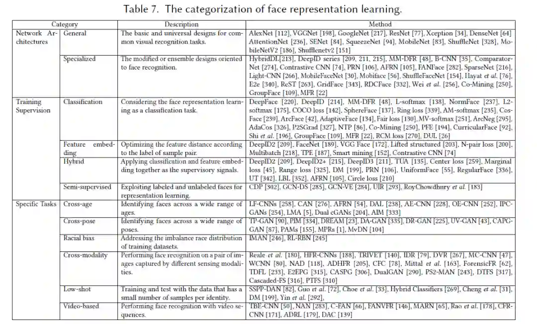 人脸表征利用深度卷积神经网络模型从预处理后的人脸图像中提取具有身份判别力的特征,这些特征用于计算匹配人脸之间的相似度。我们从网络模型架构,训练监督,以及具体的识别任务三个方面对人脸表征分别进行介绍,方法的具体分类可参考下表 3。
