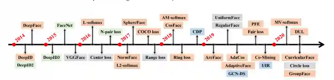 下图 7 是人脸表征训练监督方法的发展历程,包含了分类学习、特征嵌入、混合方法以及半监督学习四种方案。