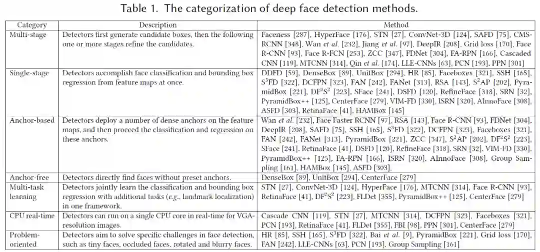 给定一幅输入图像,人脸检测的目标是找到图像中所有的人脸,并给出所有人脸的包围框的坐标和置信度得分。为了让读者更好的认识和理解人脸检测的发展,研究者从多个角度对人脸检测方法进行了分类,包括多阶段、单阶段、anchor-based、anchor-free、多任务学习、CPU 实时、面向问题等方法,具体分类可以参考下表 1。