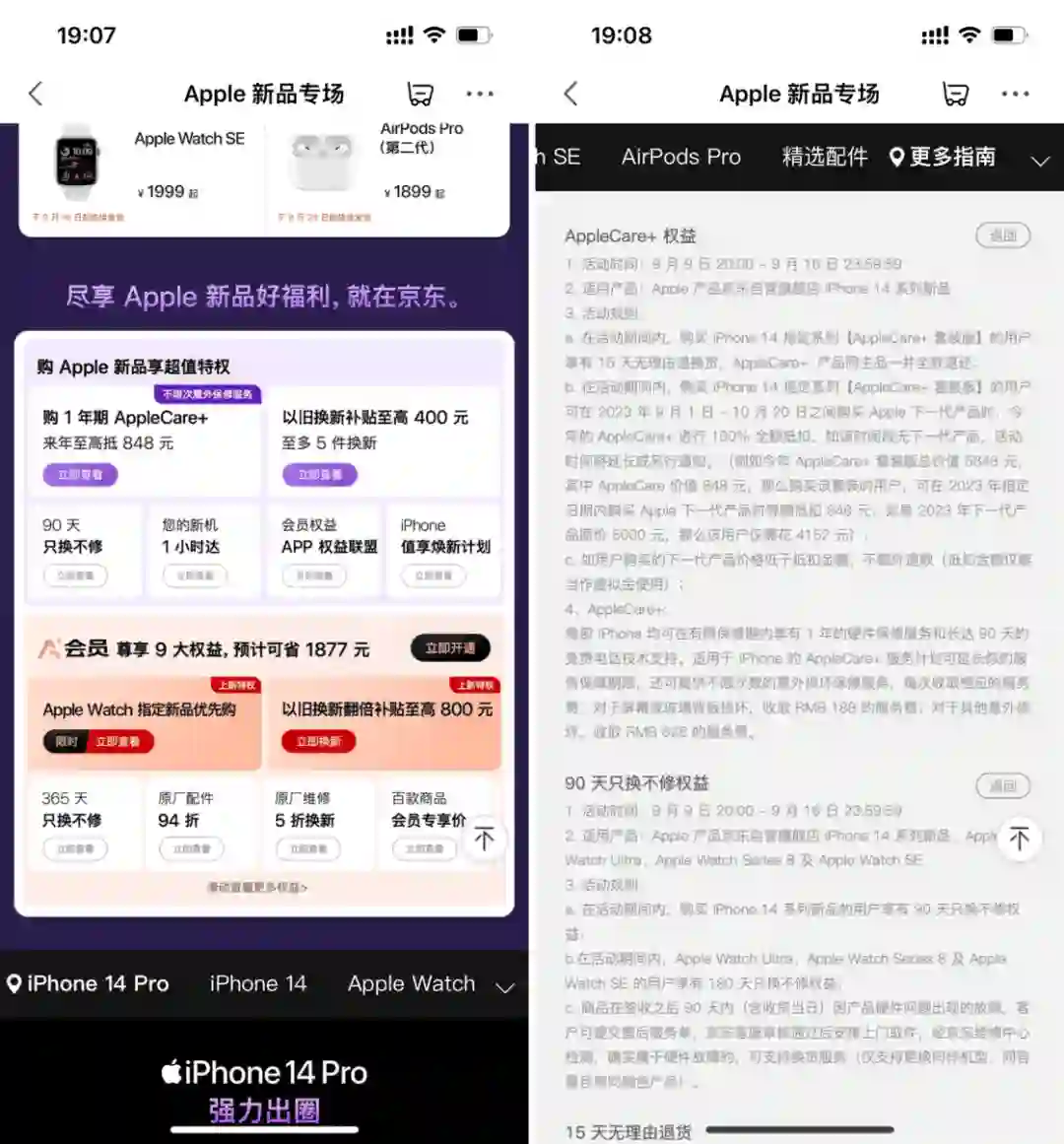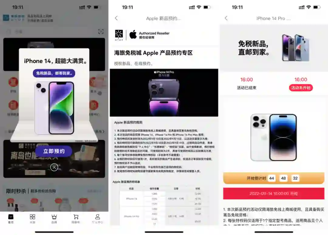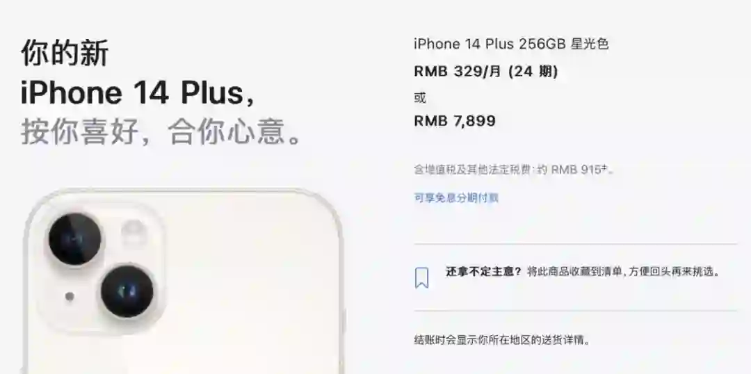 在这里,我要单独将 iPhone 14 Plus 分出来做一个小讨论。不单单只是因为它发售时间更晚,而是它独特的形态。可以说,iPhone 14 Plus 十分具有「卖爆」的潜力。从过往的手机更新历史来看,更大的屏幕一定是更具有吸引力的。相信 Apple 也是充分感受到了消费者「嘴上说喜欢小屏实际上根本不买」的嘴脸和 iPhone mini 系列的惨淡销量,在今年砍掉了 mini 机型,转而推出更大的 Plus。相信在 iPhone 11 系列及之前的用户群体中,iPhone 14 Plus 有着很大的吸引力。不过,其实它还有一种更加特殊的情况:给长辈买手机。iPhone 14 Plus 推出之后,我愿意称它为最适合给父母和老人买的智能手机之一:它屏幕大,有更多的面积来显示放大之后的文字内容,而满血的 A15 芯片也拥有「战未来」的性能,续航也是历代 iPhone 中最强的。同时,它铝合金的设计足够轻薄,影音体验卓越。再加上 iPhone 内置的不少辅助功能和 iOS 封闭的生态环境,更加易用的同时,还大大降低了长辈手机上总是被各种毒瘤软件和广告拖垮的风险。▍在哪里买作为最新款 iPhone,除了 Apple Store 外,各家都是争先恐后推出了各种预约优惠活动。