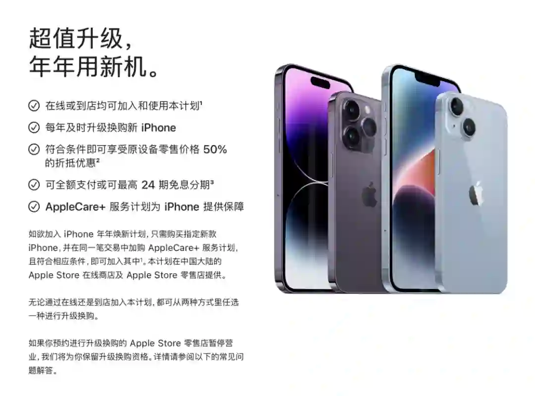 不过作为最快、最保险和最值得信赖的选择,Apple Store 即使没有优惠却依然是最佳的购机方式。而且,24 期免息分期对消费者的诱惑力,实际上远超其他电商平台降价或补贴几百元所带来的小优惠。只要你拥有招商银行、建设银行、工商银行信用卡,额度达到或超过你心仪的 iPhone 售价,即可在付款时选择。与此同时,花呗额度足够的消费者,也可以在 Apple 官网或者天猫旗舰店选择 12 期免息分期。如果你现在的 iPhone 拥有「年年焕新」计划,可以在开售预约时选择前往线下的 Apple Store 直营店,以设备原售价的半价折抵购买新 iPhone。此外,原机器的 AppleCare+ 也可以按照剩余服务时间退款,退回的款项不但可以用来折抵购买新 iPhone,也可以用于折抵购买新 iPhone 的 AppleCare+ 服务。与去年 iPhone 13 系列不同的是,今年的 iPhone「年年焕新」计划取消了「线上购机线上换,线下购机线下换」的限制,无论是在 Apple Store 的在线商店还是实体直营店购买的新款 iPhone,只要加入了「年年焕新」,未来符合条件时,就可以从线上或线下两种方式里任选一种进行升级换购。值得一提的是,你可以通过「年年焕新」预约一台新 iPhone,在线下购买时向店员表示,你不想折抵旧机而是全款支付,也同样可以购买到新 iPhone。根据去年的实测,通过「年年焕新」渠道能够抢到首批 iPhone 购买资格的概率,可能要比在官网选购新机的方式更大一些(原因之一是不需要付款,而是在线下购买时才支付)。对于不满足年年焕新的其他 Apple 设备,也可以通过 Apple Trade in 计划进行折抵。价格虽然相比第三方平台或自售二手要低,但胜在省心和可以多个 Apple 设备同时折抵,且 Apple 对符合折抵要求的设备是「不看成色」的 —— 只要不是屏幕或背板碎裂及严重损伤,小磕碰和正常使用带来的旧损,均不影响折抵的价格。