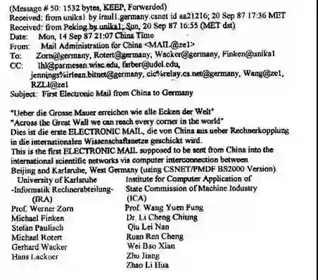 1987年9月,CANET(中国学术网)在北京计算机应用技术研究所内正式建成中国第一个国际互联网电子邮件节点,并于9月14日发出了中国第一封电子邮件:“Across the Great Wall we can reach every corner in the world.(越过长城,走向世界)”,揭开了中国人使用互联网的序幕。