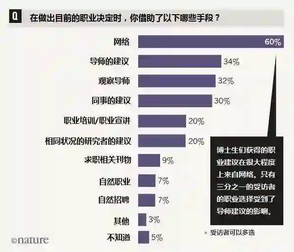 在很大程度上,博士生是自己的职业顾问。在被问到是如何做出目前的就业决定时,差不多三分之二的人表示是靠自己搜索调查;只有34%的人表示是来自导师的建议。