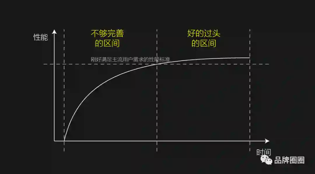 因为市场是有周期性的,每个市场都会从“不够完善”的产品市场区间,逐步发展到“好的过头”的产品市场区间。而最能凸显品牌价值的,是“不够完善”的产品市场区间。