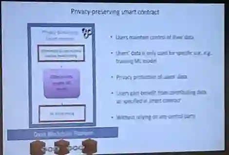 人工智能、计算机安全、区块链等技术之间的协同作用。例如,在设计一个数据集市(数据来源)时,用户可能由于其信息被泄露而受到损害。然而,我们可以通过智能合约技术保证用户的数据将仅仅被用于拟合机器学习模型,而用户将从中收到报酬。所有这些对这些数据的隐私安全保护方法都要归功于差分隐私技术。我知道,你在这一段中看到了许多流行的概念,考虑到 Song 教授的一系列工作的记录,这个领域可能还有很多值得研究的空间。