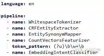 pipeline:有了组件之后,如何将组件按部就班,井然有序地拼装起来,并正常工作呢?因此就有了pipeline这个概念,其实在机器学习领域,pipeline这个概念已经存在很长时间了,它在很多框架中都有,比如大名鼎鼎的sklearn。使用pipeline的好处在于可以合理有序管理不同任务阶段的不同组件工具,当组件数量较多时,pipeline的好处就非常明显了。而在rasa中,pipeline的使用更为便捷,是通过yml配置文件实现。即开发者只需要定义好自己的组件,然后将组件配置在配置文件中就可以,即插即用。下图是一个简单的pipeline配置实例: