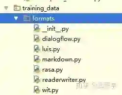 train方法。既然是使用条件随机场来进行实体抽取,那么就需要进行模型训练。因此需要定义train方法,来训练模型。关注train方法的两个参数training_data和config。其中,config就是之前提到的配置pipeline的配置文件的读取对象。training_data是TrainingData类型的对象。你可以将其类比于pytorch中的data_loader功能,它的主要作用是对训练数据进行封装,拆分训练集验证集,做数据校验等工作。说到这里,提一下rasa支持的原始训练数据的存放格式,主要支持markdown,wit,luis等文件格式,当然也可以提供json格式的数据。rasa如何读取这些格式的训练数据则是在如下代码包里定义: