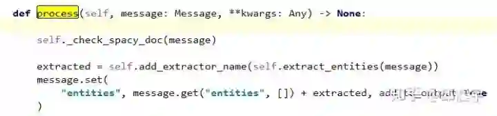process方法。这个可以说是组件里面最重要的一个方法。当前面一通操作之后,只得到了模型,如何调用这个模型并处理文本,就是process方法的工作了。最后在message中增加一个dict,名为entities,用来存放提取的实体信息,包括实体的类型,实体的在文本中的start和end的位置信息等。