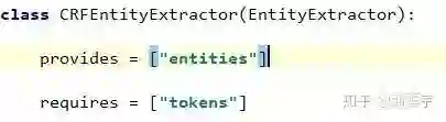 其次,每个component需要定义一个类变量provides和requires,分别表示这个组件所提供的中间成果和依赖的上游任务。对于CRFEntityExtractor来说,它提供了实体的抽取,同时为了进行实体抽取,需要先对文本进行分词,因此需要上游任务先完成tokenizer任务,提供tokens的中间成果。