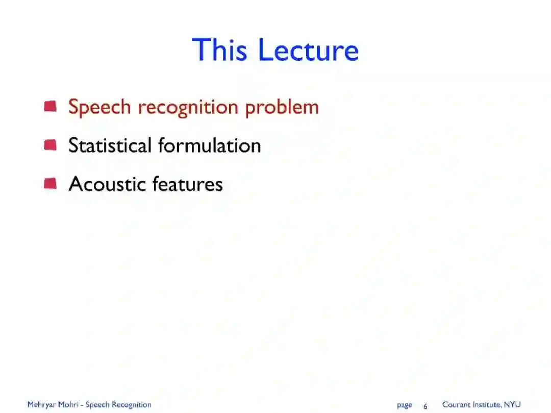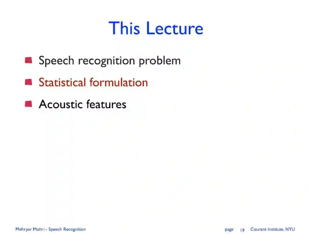 Lecture 01: introduction to speech recognition, statistical formulation.