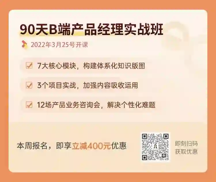 向你推荐《90天B端产品经理实战班》,带你掌握系统的B端产品工作方法,助你实现转岗&提升专业能力,实现涨薪小目标!