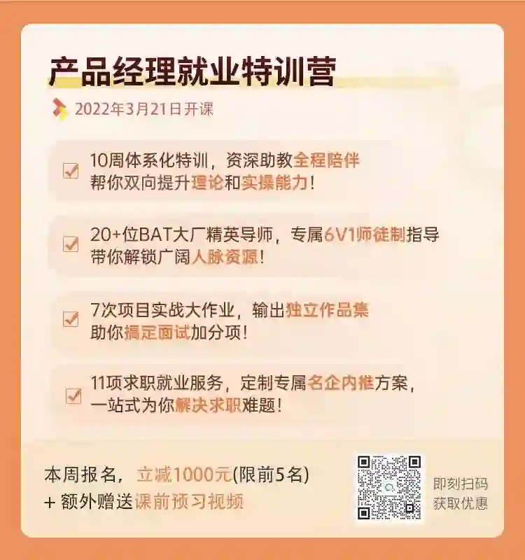 为帮大家金三银四顺利拿Offer,特训营以BAT级大厂能力模型为蓝本,10周带你胜任初级产品岗。目前已有2000+位学员,通过我们的求职辅导名企内推成功就业!