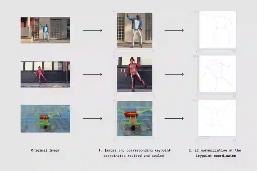 温习了余弦相似度的概念之后,让我们回到之前的话题。理论上,直接将关键点数据转为向量后,就可以比较其余弦相似度了。实际上,还需要处理一些细节,这是因为数据集中的图像尺寸大小不同,不同的人也可能出现在图像的不同局部。