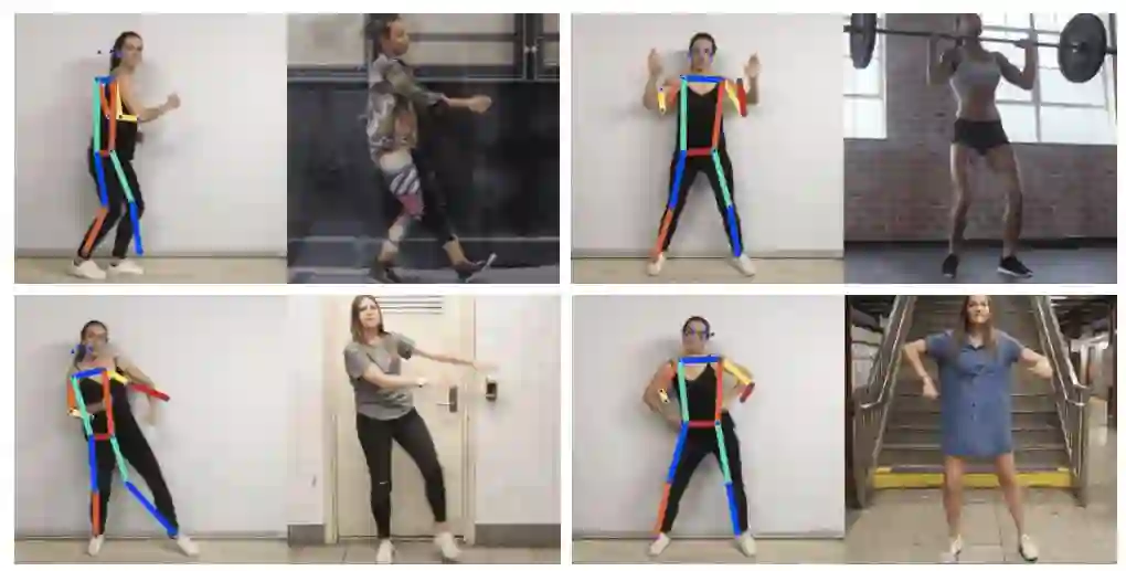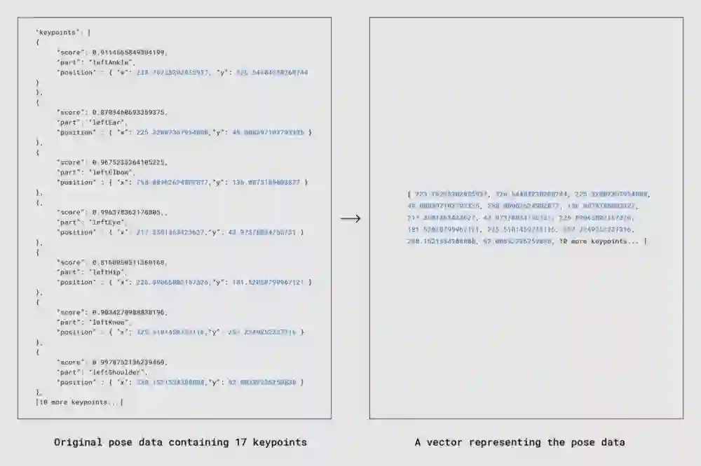 最终,团队选择了包含多种动作,不同体型、肤色、文化的一组视频,将其切分为8万张静止图像。使用PoseNet处理这些图像,并储存相应的位姿数据。