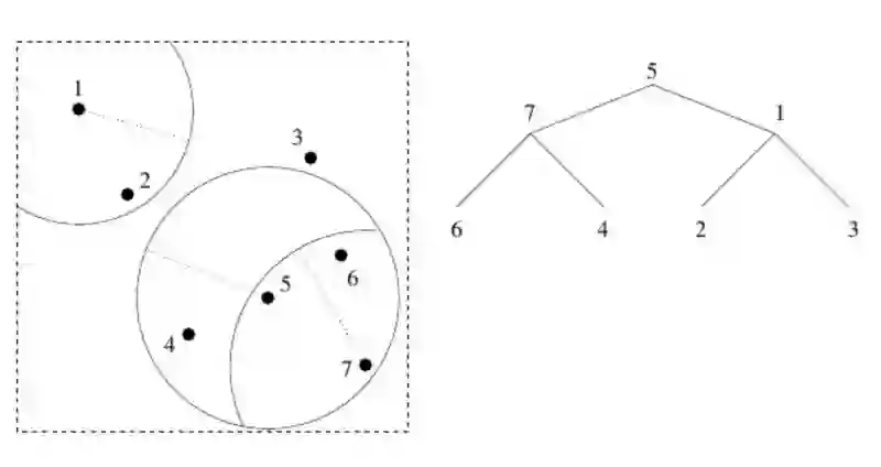 我们在数据点中选取一点(可以随机选取)作为根节点(上图中为5)。我们绕着5画一个圈,将空间分割成圈内和圈外两部分。接着我们在圈内、圈外各选一点作为制高点(上图中为7和1)。接着,绕着每个制高点各画一个圈,同样在圈内、圈外各选一点……以此类推。这里的关键在于,如果我们从点5开始,然后发现7比1更接近目标,那么我们就可以跳过1的所有子节点。