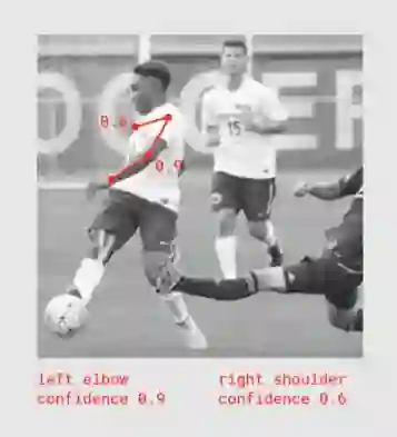 左肘在画面中清晰可见,置信度较高;右肩在画面中不可见,置信度较低