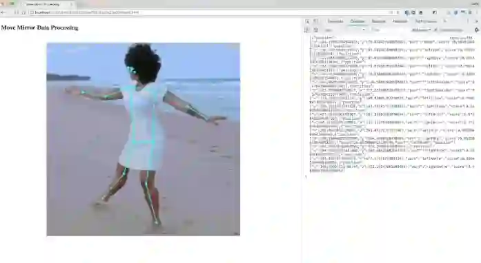 表现出色,又是自家出品,所以Move Mirror团队顺理成章地选择了PoseNet作为应用背后的模型。在原型开发阶段,团队通过简单的web API访问PoseNet模型,这极大地简化了原型开发流程。只需向内部的PoseNet API接口发送一个HTTP POST请求,提交base64编码的图像,API就会传回位姿数据(基本无延迟)。若干行JavaScript代码,一份API密钥,搞定!